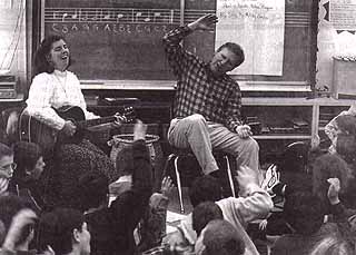 This program is designed for young people to put together their own songbook. Materials such as songsheets, colorful paper, notebooks and a tabl e of contents will be provided. By following the artists' selections & suggestions, the students will assemble a collec tion of songs for a sing-along. John and Trish will introduce each piece by the characteristic traits that make a song either a folk song, a popular song, a historical ballad or whatever category bes t describes that song's style. They will perform the song with the students singing along and demonstrate how to play simple accomp animent on several instruments. The notebook will be a colorful piece that the student will take pride in putting together . It is designed so that they can add their own songsheets. Through this activity young people build musical, rhythmic, lyric & folklore skills. They learn a constructive approach to journal making, collecting, singing, playing instruments and they use this program as a catal yst for personal music making. The artists talk about music resources, finding or purchasing instruments, songwriting, copyright laws and playing in ensembles or bands. (materials fee: $3.00/student)